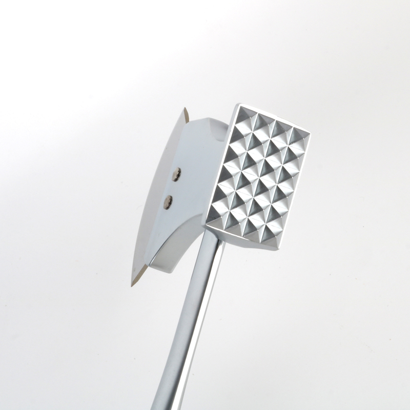 ऑल-इन-वन टूल जे नवीन डिझाईन झिंक ॲलॉय मीट टेंडरायझर आणि पिझ्झा कटर दोन्ही म्हणून काम करते, त्याची लांबी 25 सेमी आहे. पुढचे टोक दोन फंक्शनल पृष्ठभागांमध्ये विभागले गेले आहे: एक मीट टेंडरायझरसाठी आणि दुसरे पिझ्झा कटरसाठी. हँडलला ऑप्टिमाइझ केलेल्या चापने डिझाइन केले आहे आणि एक प्रौढ होल्डरच्या जवळ जाड होल्डरचा भाग आहे. हात. एबीएस प्लास्टिकची उशी देखील हँडलच्या शेपटीत जोडली जाते ज्यामुळे तळहाताचे दुखणे कमी होते आणि दीर्घकाळापर्यंत वापर करताना आराम मिळतो.