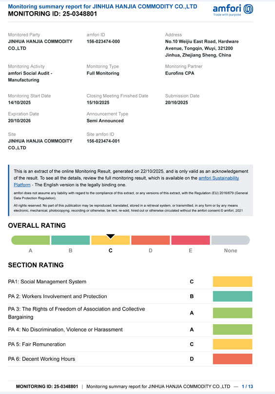 Jinhua Hanjia Commodity Co., Ltd. ने त्यांच्या BSCI लेखापरीक्षणाचे निकाल प्रसिद्ध केले आहेत. 14 ऑक्टोबर रोजी, कंपनीने व्यावसायिक मूल्यमापन यशस्वीरीत्या उत्तीर्ण केले आणि ग्राहकाने निर्दिष्ट केलेल्या किमान आवश्यकतांची पूर्तता करणारे वर्ग C प्रमाणपत्र प्राप्त केले. या प्रमाणपत्राची वैधता कालावधी एक वर्ष आहे. AUBS द्वारे निवडलेल्या एजन्सी OFCIIN द्वारे आयोजित करण्यात आली होती. ग्राहक. हा ग्राहक आमच्या कंपनीकडून वाइन ओपनर, वाईन ॲक्सेसरीज आणि कॉकटेल शेकर सारखी स्टेनलेस स्टील उत्पादने बर्याच काळापासून खरेदी करत आहे. ग्राहकाच्या देशाला पुरवठादारांकडे हे प्रमाणपत्र असणे आवश्यक आहे.