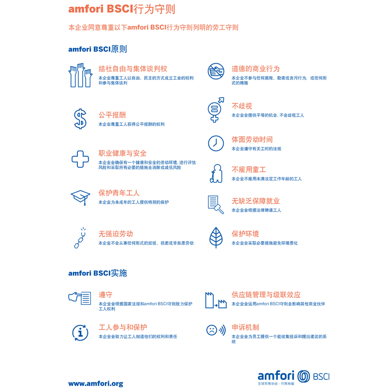 BSCI नियमांच्या आवश्यकतांनुसार, आमची कंपनी BSCI तत्त्वांची प्रभावी अंमलबजावणी सुनिश्चित करण्यासाठी Amfori BSCI आचारसंहितेमध्ये नमूद केलेल्या कामगार मार्गदर्शक तत्त्वांचे काटेकोरपणे पालन करेल. उत्पादन प्रक्रियेदरम्यान, आम्ही मुक्त आणि लोकशाही पद्धतीने संघटना स्थापन करण्याच्या कामगारांच्या हक्कांचा आदर करतो आणि सामूहिक श्रम-विना-बार्गेनिंगमध्ये सहभागी होण्यासाठी आम्ही कामगार-कर्मचारी बांधील आहोत. आणि कामगारांना न्याय्य श्रम पद्धती आणि नुकसान भरपाई मिळेल याची खात्री करा. याव्यतिरिक्त, आम्ही हमी देतो की कामगारांना योग्य कामाचे तास आणि इतर मूलभूत अधिकार आहेत.