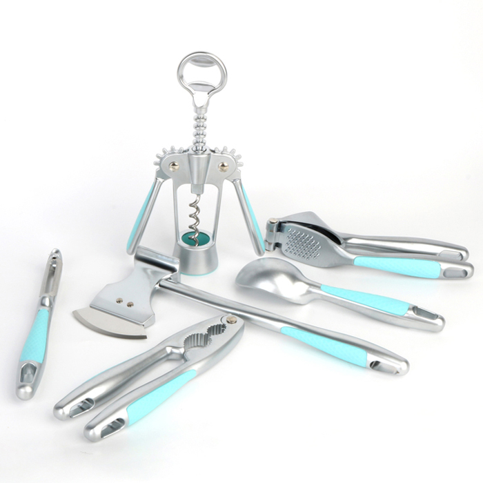 होम किचनसाठी हे प्रीमियम झिंक अलॉय टिकाऊ नट क्रॅकर आधुनिक घरगुती वापरासाठी डिझाइन केलेल्या नवीन 10-पीस प्रीमियम किचनवेअर सेटचा एक भाग आहे. संग्रहामध्ये वाईन ओपनर, पिझ्झा कटर, मीट टेंडरायझर, लसूण प्रेस, कॅन ओपनर, व्हेजिटेबल पीलर आणि नट क्रॅकरचा समावेश आहे. एकसमान वितरीत केलेले भौमितिक आकृतिबंध जे व्हिज्युअल अत्याधुनिकता जोडतात. मॅकरॉन-प्रेरित पेस्टल रंगछटांचा वापर एकंदर सौंदर्याचा दर्जा उंचावतो, उत्पादनाला स्टायलिश किचन ऍक्सेसरीमध्ये रूपांतरित करतो. नट क्रॅकरची एकूण लांबी 17 सेमी असते ज्याची कमाल रुंदी 5 सेमी असते आणि वजन 220 ग्रॅम वजनाचे असते. हार्ड-शेल्ड, सॉफ्ट-शेल्ड आणि स्प्लिट-शेल वाणांसह प्रकार. अर्गोनॉमिक हँडलमध्ये शेवटी एक लटकणारा छिद्र आहे, ज्यामुळे भिंतीवर सोयीस्कर माउंटिंग आणि स्टोरेज स्पेसची कार्यक्षमता वाढवता येते.