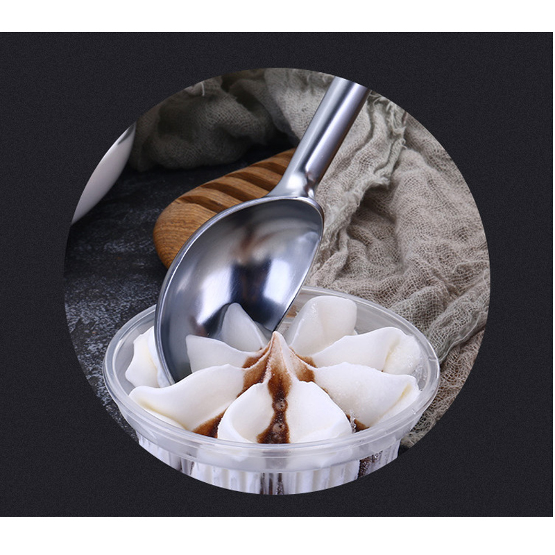 सीमलेस डाय-कास्टिंगद्वारे प्रीमियम झिंक अलॉयपासून तयार केलेल्या आरामदायी ग्रिप हँडलसह हे झिंक अलॉय आइस्क्रीम स्कूप, स्कूपमध्ये कोपऱ्यांशिवाय सहजतेने आच्छादित कडा आहेत, ज्यामुळे आरामदायी, गोलाकार पकड अनुभव येतो. त्याची लांबी 16.5 सेंटीमीटर असूनही, आमची 7 किलोग्राम पेक्षा फक्त 16.5 सेंटीमीटर आहे. 6-चरण पूर्ण हस्तकला उत्पादन प्रक्रिया. पृष्ठभागावर उच्च-तापमान बेक्ड फिनिश (120 डिग्री सेल्सिअस) सह लेपित आहे, एक टिकाऊ परंतु पंख-प्रकाश रचना तयार करते. स्कूप हेड अनन्यपणे डिझाइन केलेल्या 108-डिग्री बाह्य-कोन टीपसह एक ओपन-बोट आकार दत्तक घेते जे सहजतेने गोठविलेल्या क्रीमच्या दोन्ही बाजूंच्या ओक्युअर क्रीम, ओक्युअर क्रीमच्या दोन्ही बाजूंना स्लाइस करते. मुख्य भागापेक्षा खालचा, लहरी, लहरी पृष्ठभाग तयार करतो ज्यामुळे अखंड आइस्क्रीम सोडणे शक्य होते. ही विचारशील रचना कौशल्य पातळीकडे दुर्लक्ष करून कोणासाठीही सहज वापर सुनिश्चित करते.